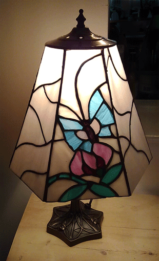 I'm surprisingly pleased with the finished piece. This project took so long that I got fed up with it & put it away in disgust for well more than a year. We've had a lot of work done on the house lately and found myself with a newly-decorated little room that really wouldn't be right without a stained glass lamp, so I brought the pieces out of retirement.